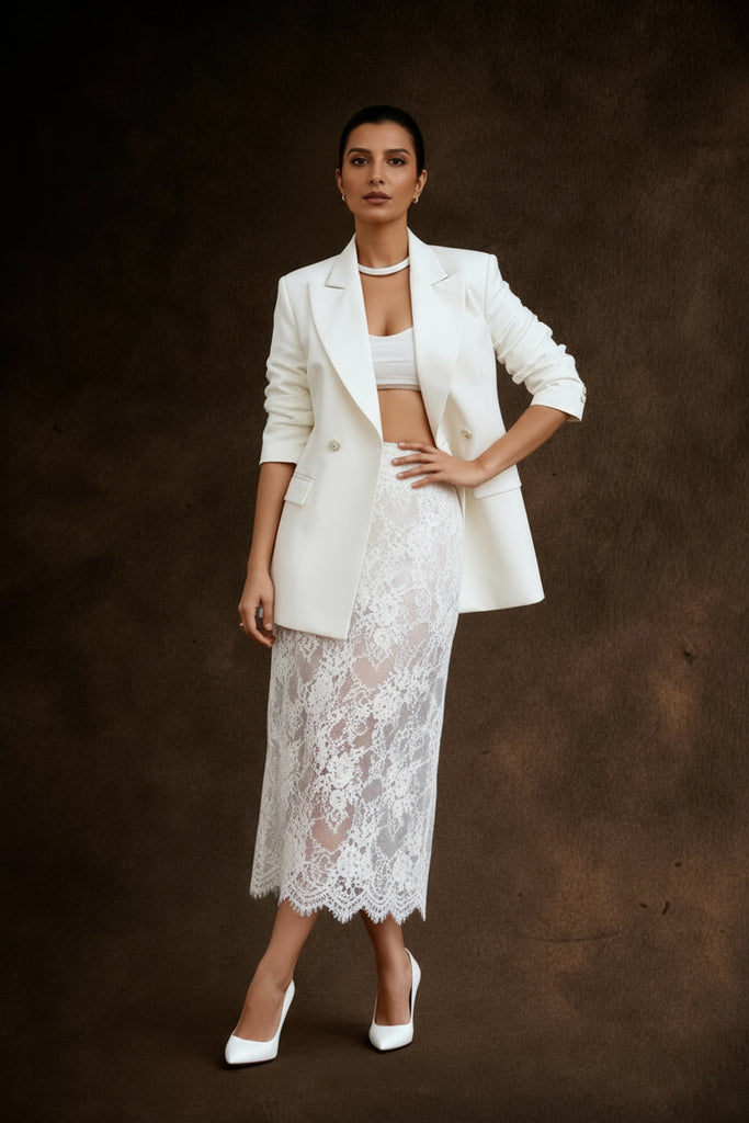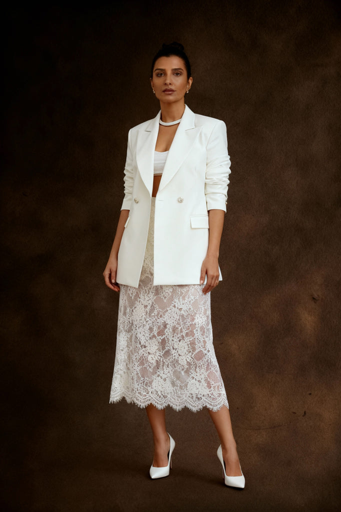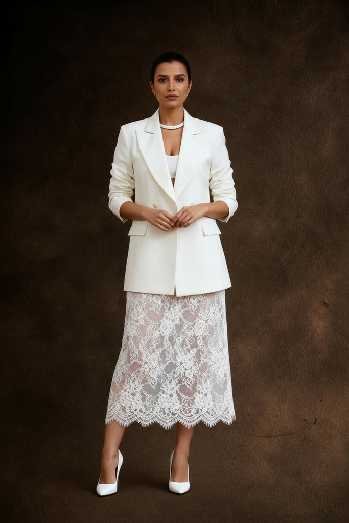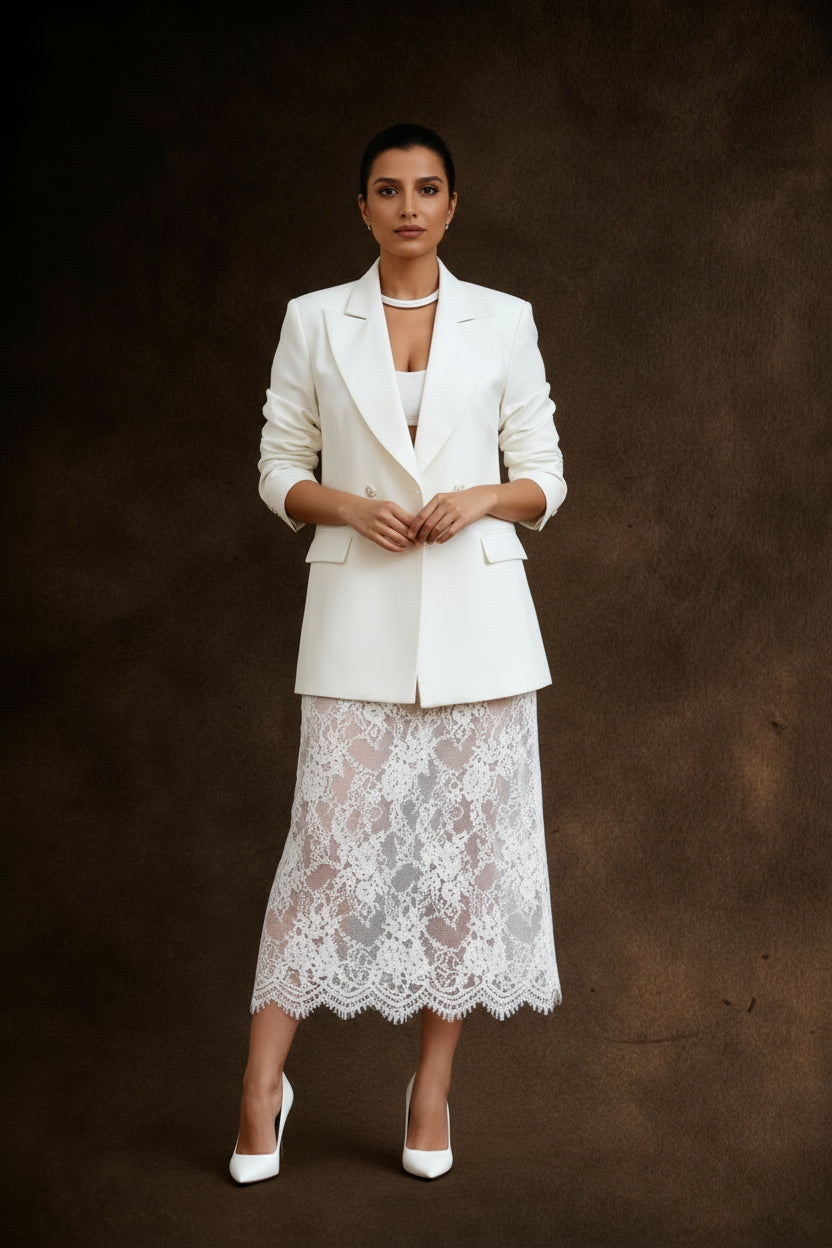 Add opulence to your evening edits with Double Breasted Snow Drop Skirt Silk Jacket Suit, its cut to a flattering and tailoring fit.