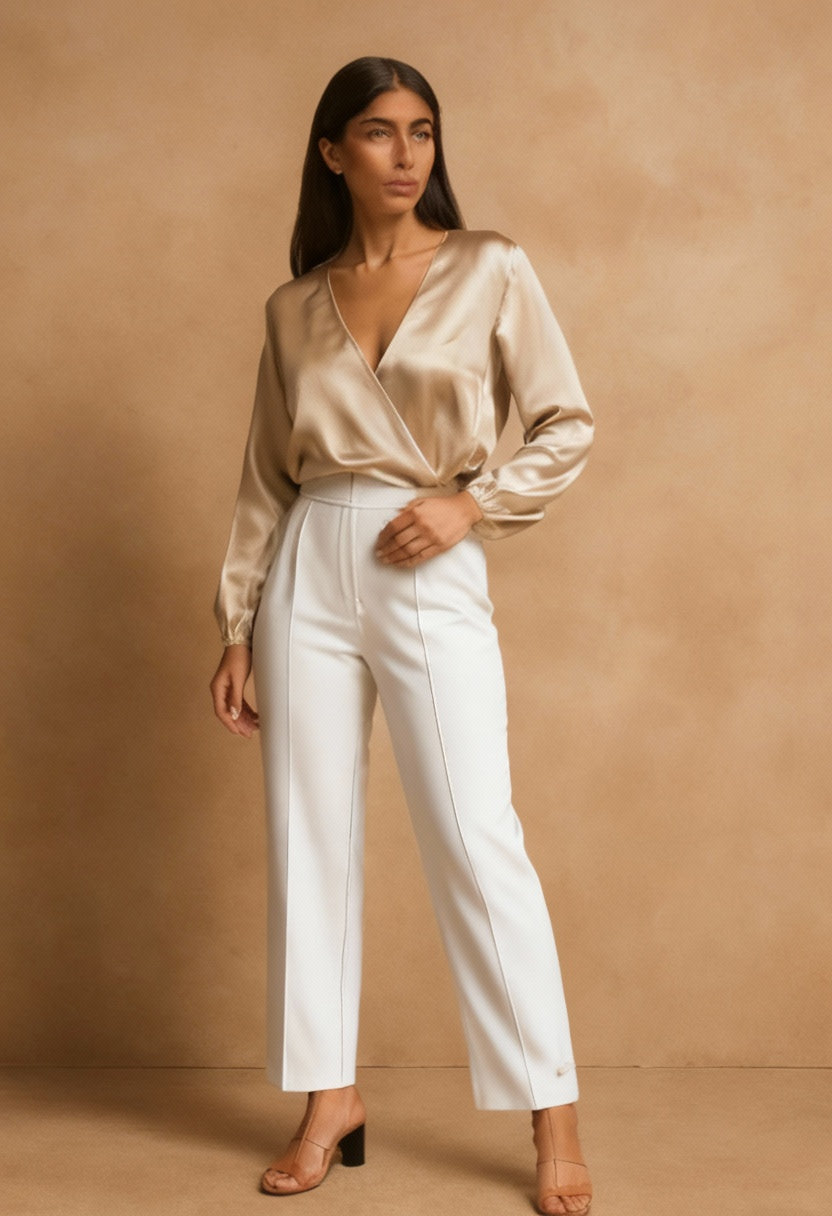 Beatrice tapered slim fit trousers crafted from premium suiting in a classic white and beige, trousers are a perfect choice for refined occasions. They’re tailored to a slim leg, with pressed creases that sharpen the silhouette.  Slim fit Side slip pockets Double hook-and-bar with zip The model is wearing a size 8 Measurements of model: Height 5ft 9" / 175cm