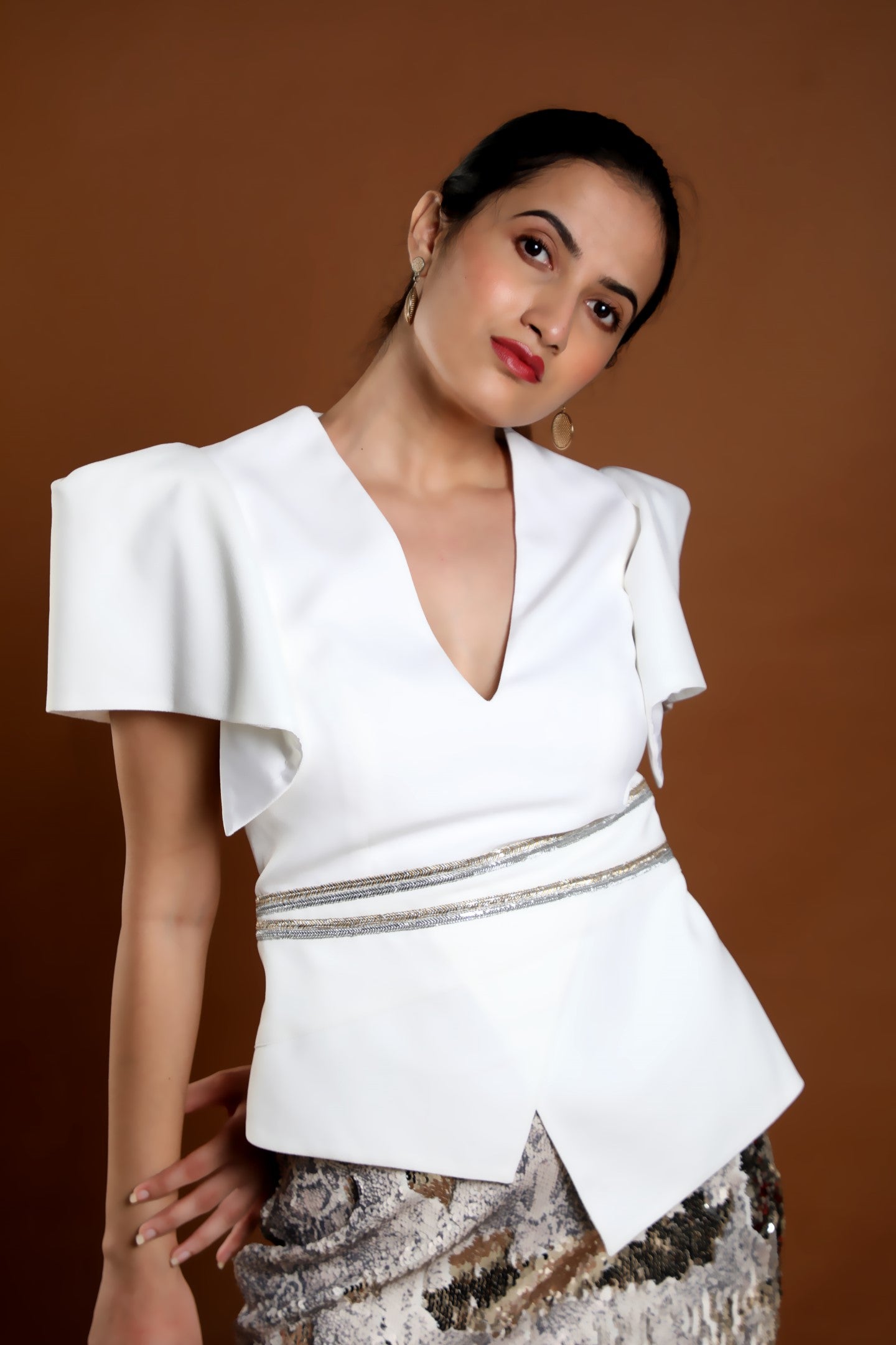 Boston is an elegant and structured blouse which accentuates the waist line to the narrowest point. Gives a nice proportion to overall body with the Peplum curve on the waist designed to fit anybody type . wear it with plain separates or sequence skirts to amplify the overall look.