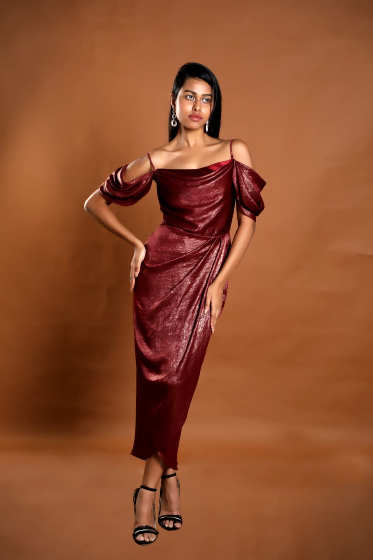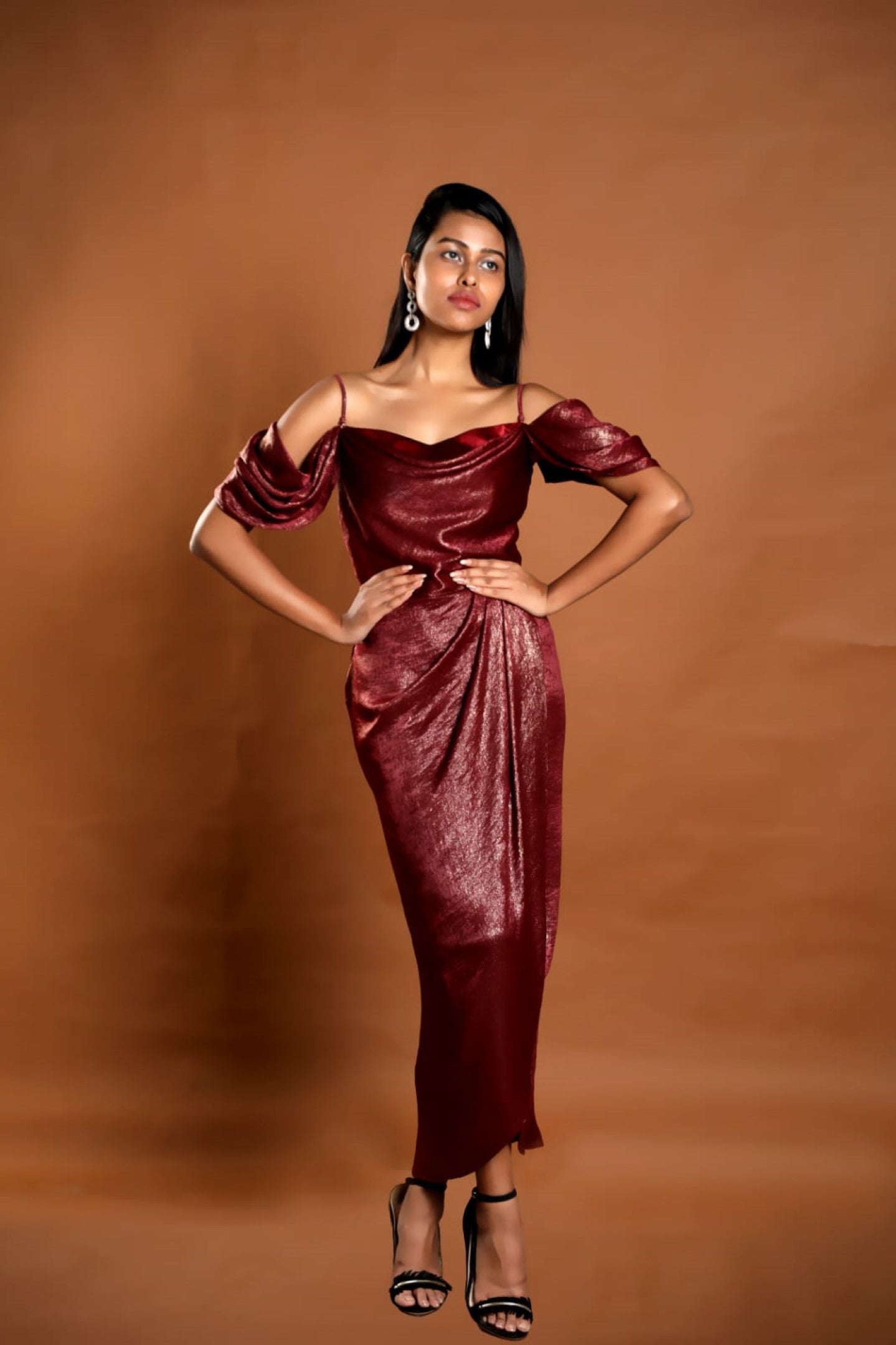 Belrose drape dress in luxe gold embossed shimmer fabric is a perfect occasion wear, subtly pleated drape at the hips and drape sleeves gives it a Victorian look