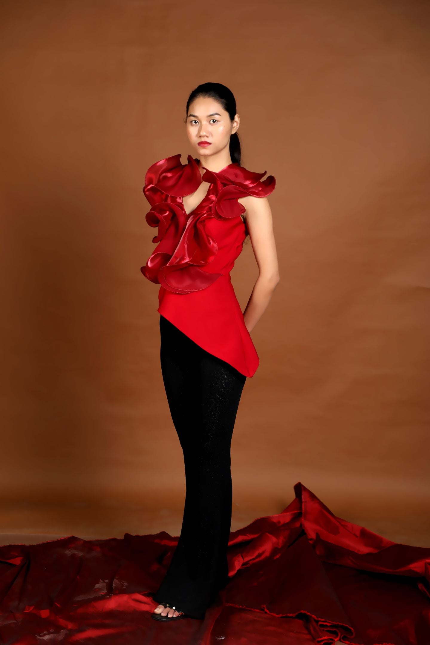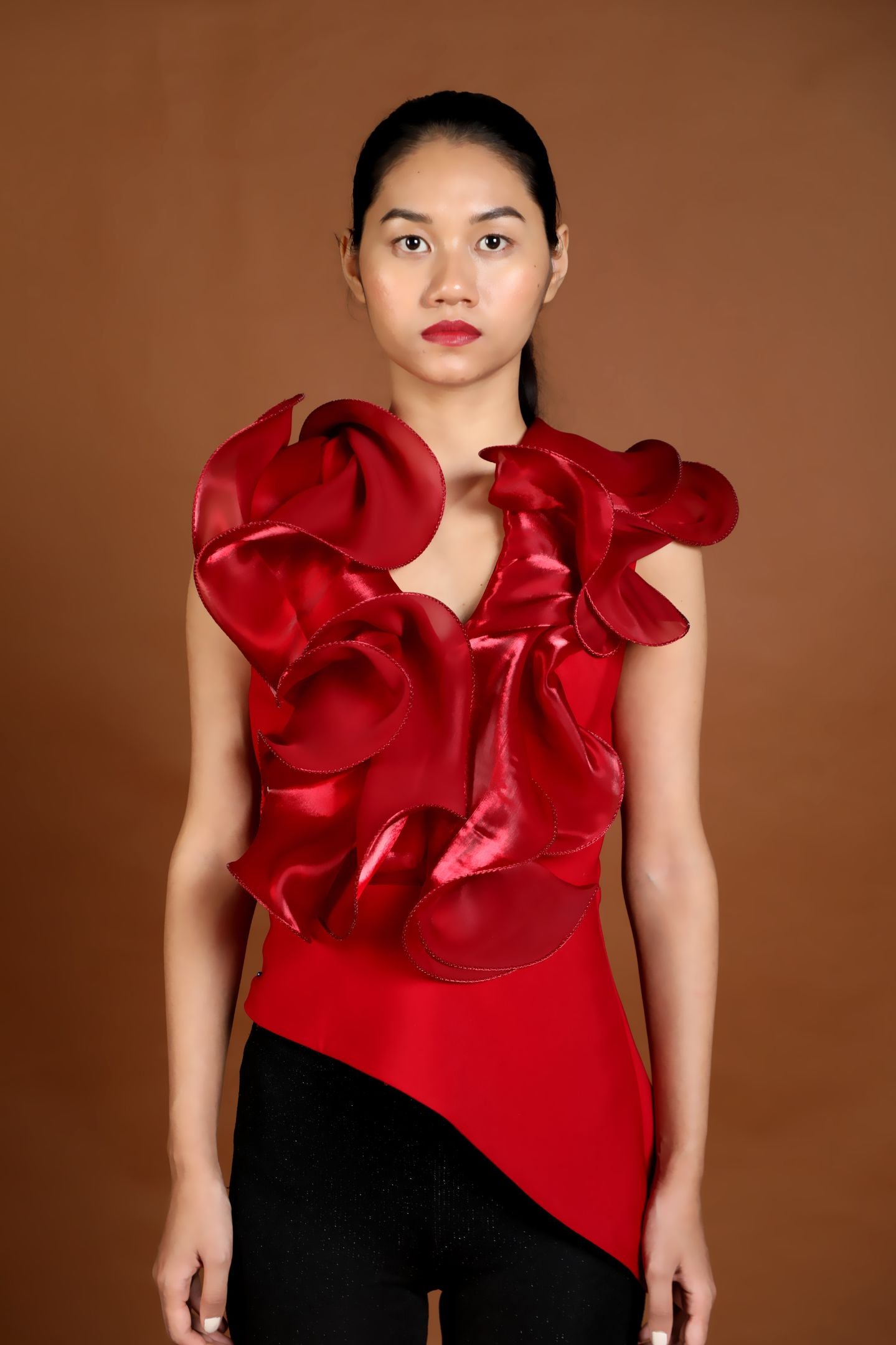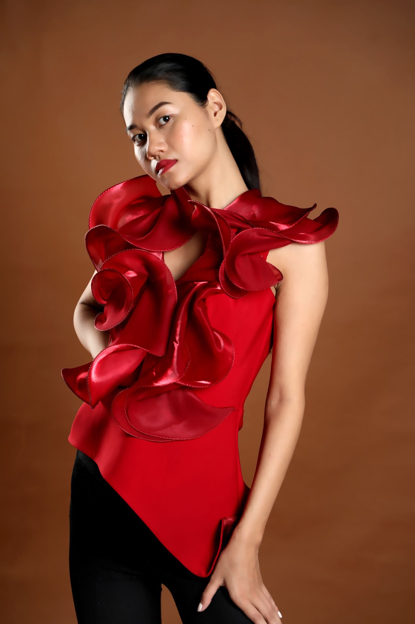 Ruffle Blouse crafted from a Fluid Silk Organza wired metallic fabrication into peplum it hugs the frame through to hip length finish. An asymmetric panel is fitted at the hip.