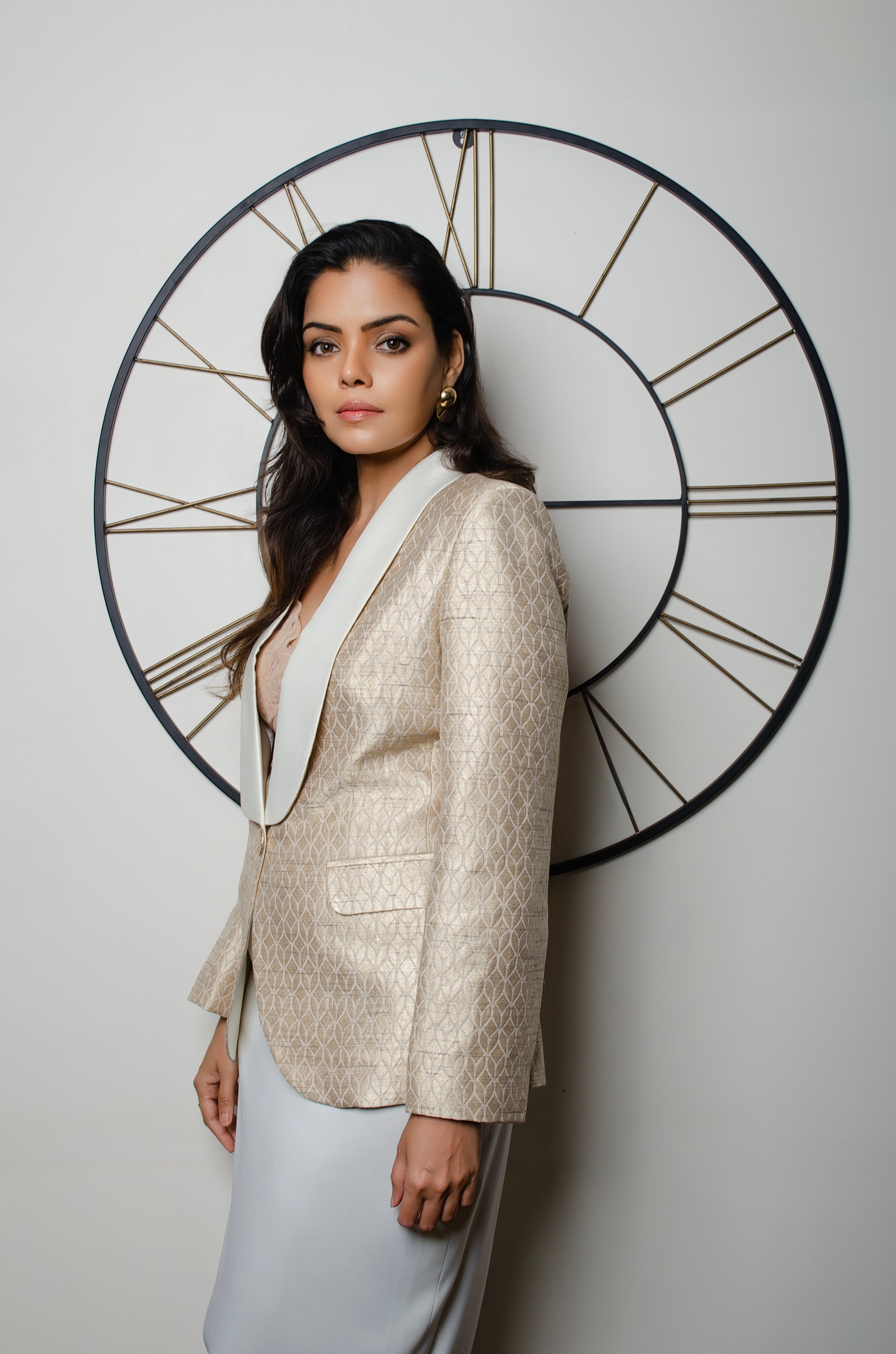 Brocade Silk Tuxedo Pantsuit with Off White Satin Lapel is a head turner in red carpet. Pair it with skirt for a  tailored  sleek and elegant fit. This Ensemble exudes sophistication and is perfect for events where a touch of luxury is desired.