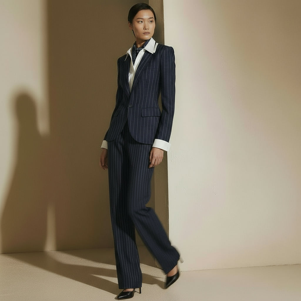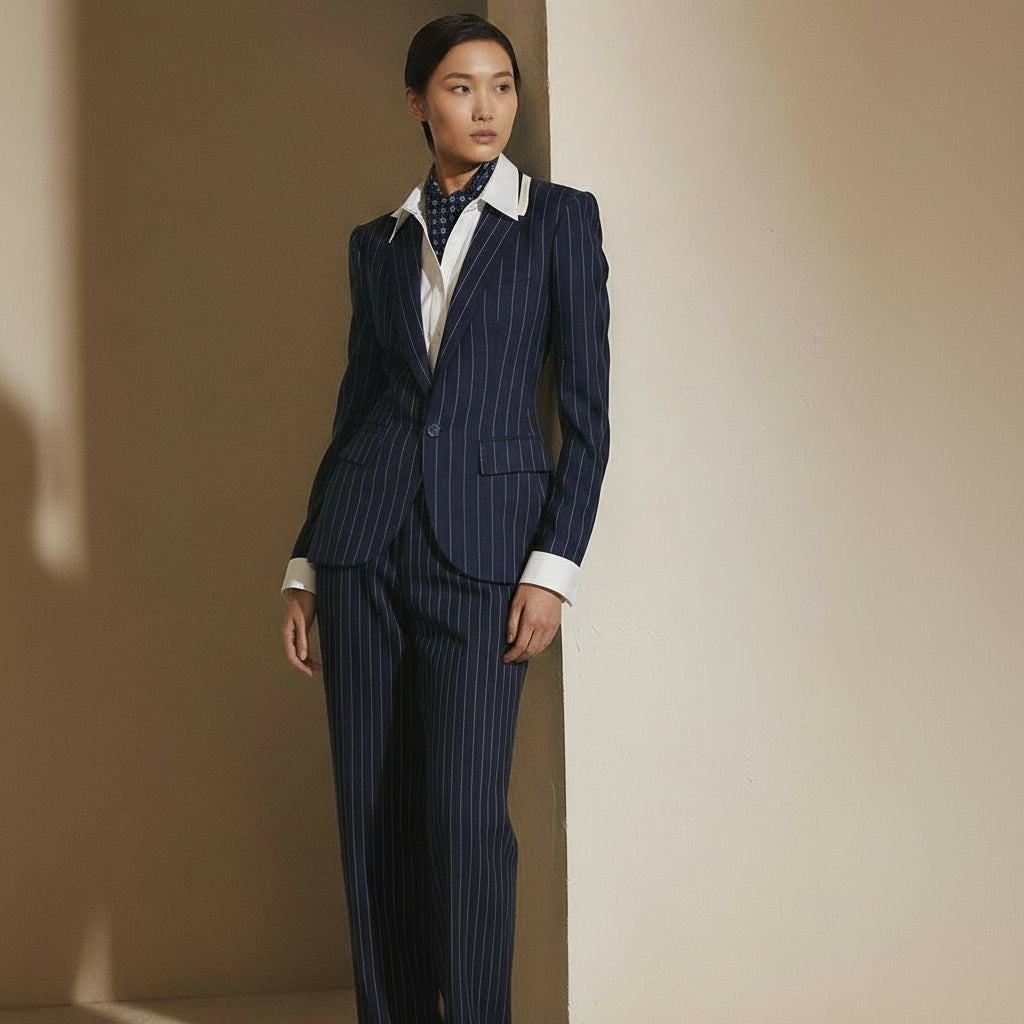 Pinstripe classic suits embody timeless sophistication with sharp, vertical lines that elongate the frame.