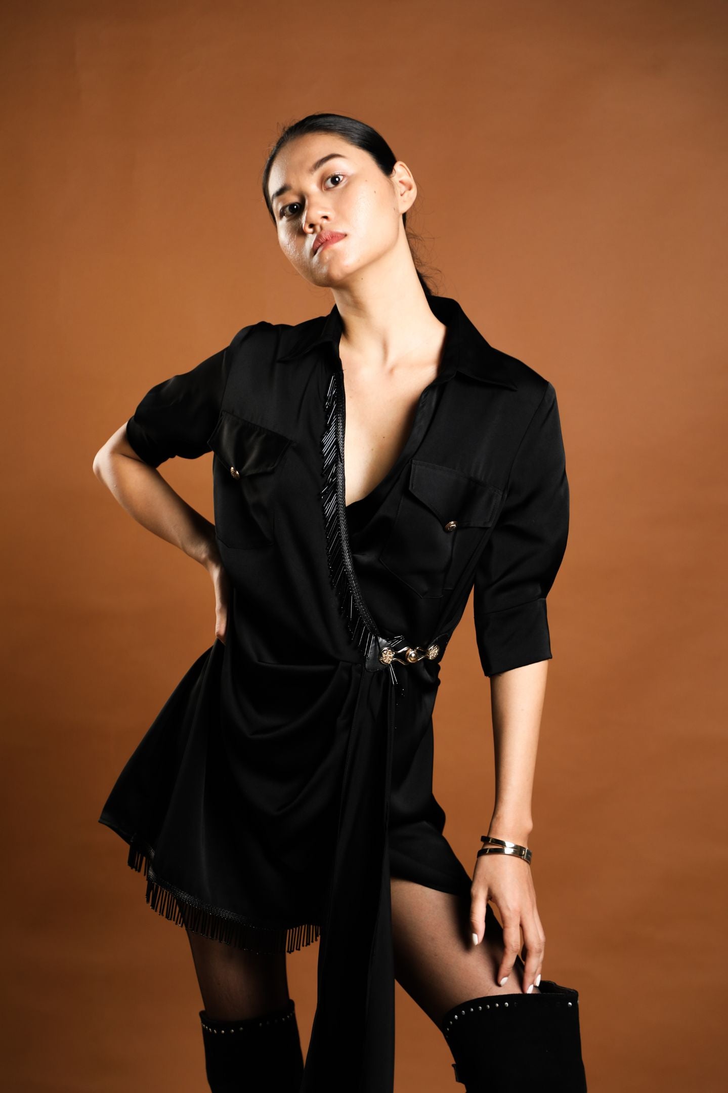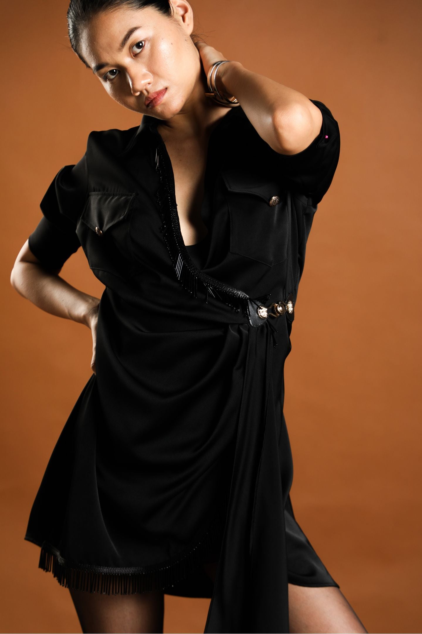 Denali wrap dress is a mood lifter crafted to a mini length with a wrap front and a flowing skirt that locks at the waist with a golden buckle. Embrace this feminine style for fun night out in our Denali chic evening wear dress with modern black beaded long tassel detailing,