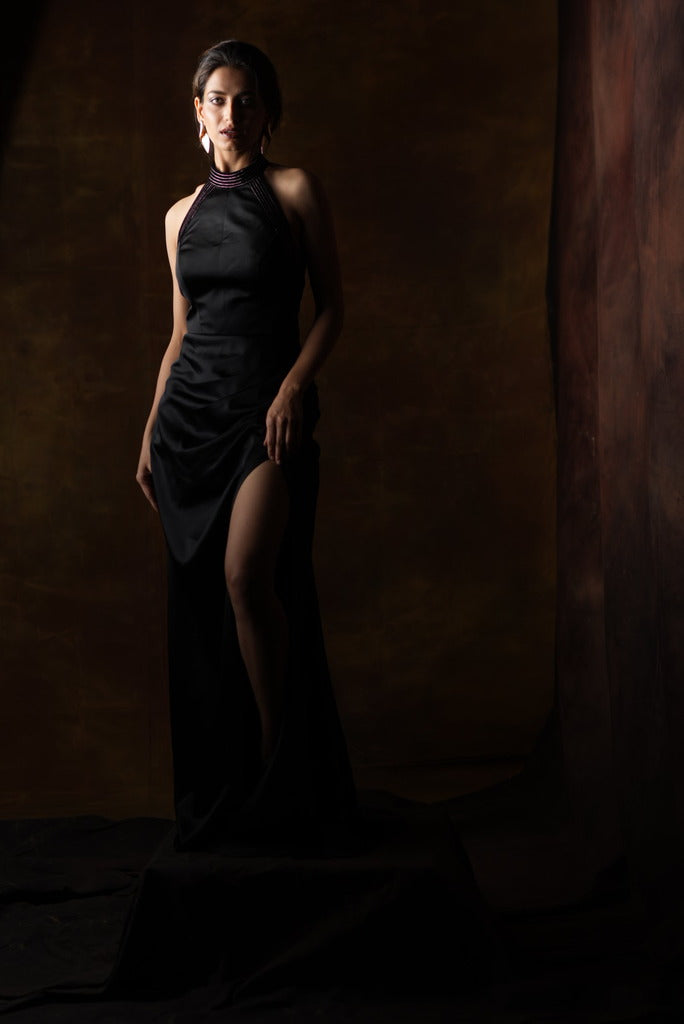 This halter neck dress features a sleek velvet black color and stylish long stripes In gold. The unique design is perfect for formal events and provides a comfortable fit. Stay chic and comfortable in this statement piece, made with high-quality Luxe Crepe to steal a look for that special occasion.