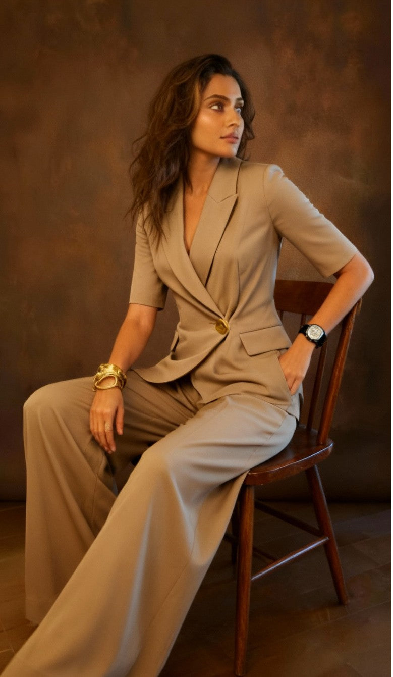 Ariya co-ordset defines timeless elegance, Cropped Sleeve single breasted non lined blazer with cinched waist that flatters with effortless precision. Blending power with poise for the modern women's presence. A wardrobe icon that speaks style with the quiet sophistication,
