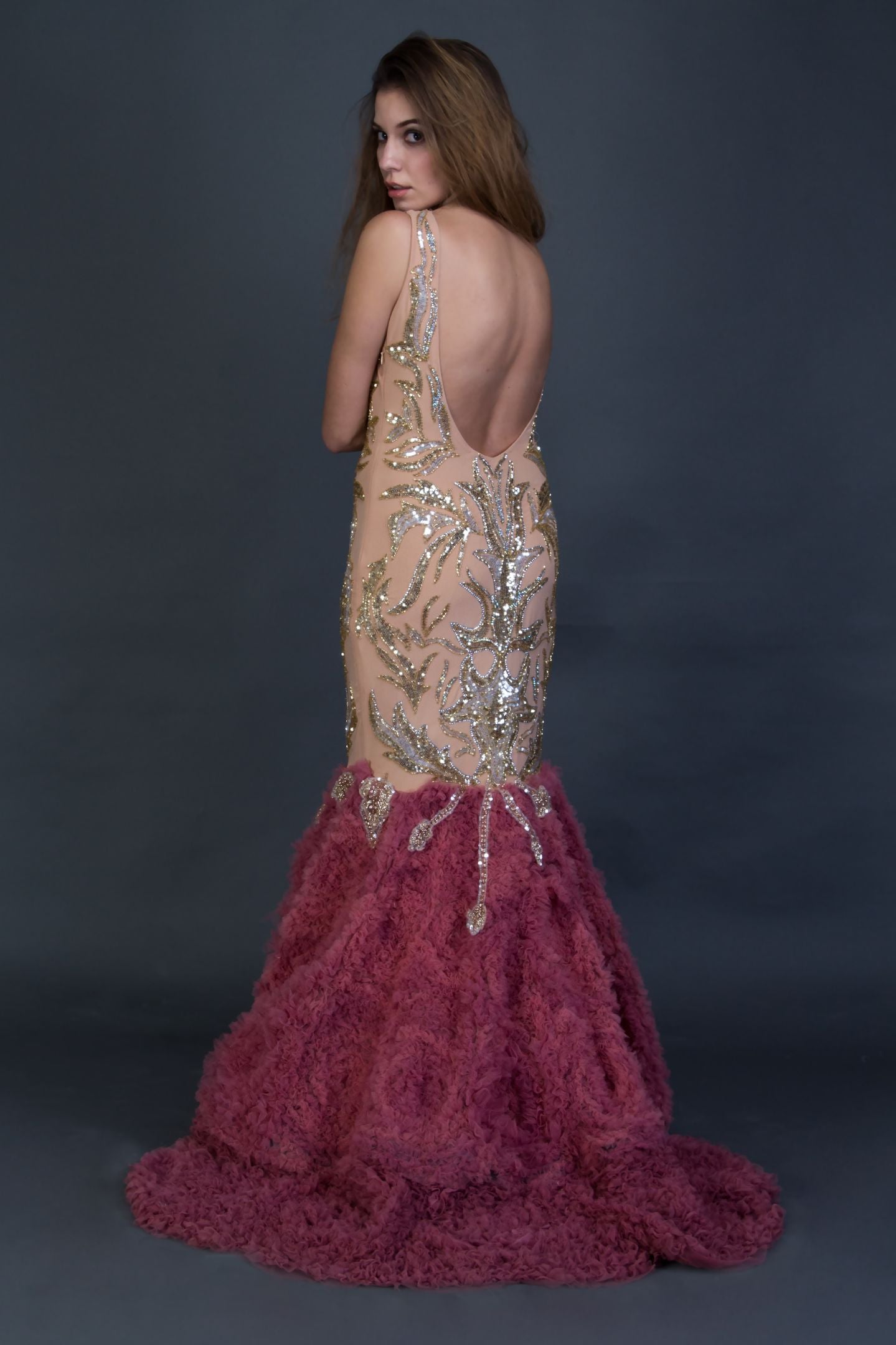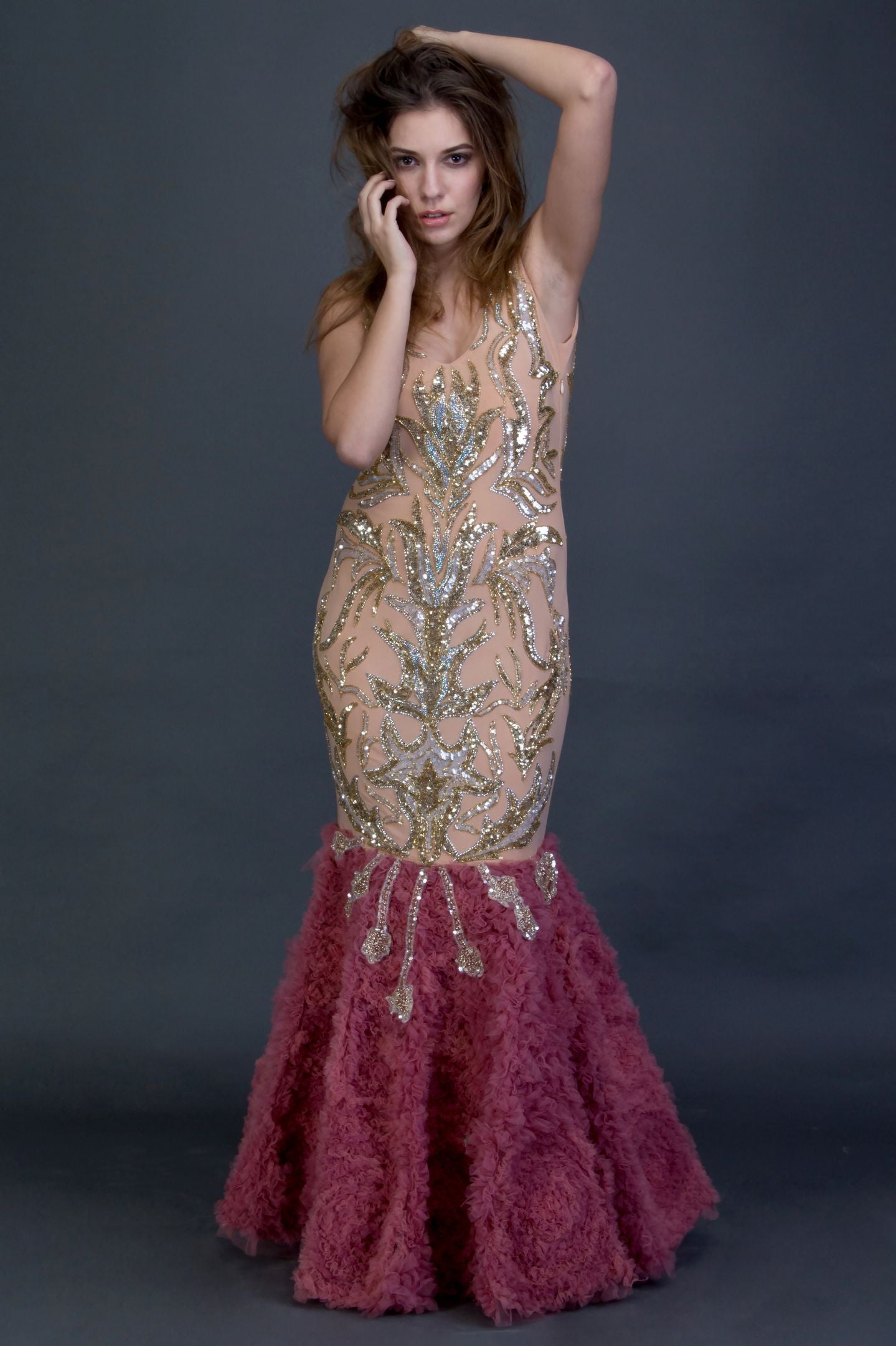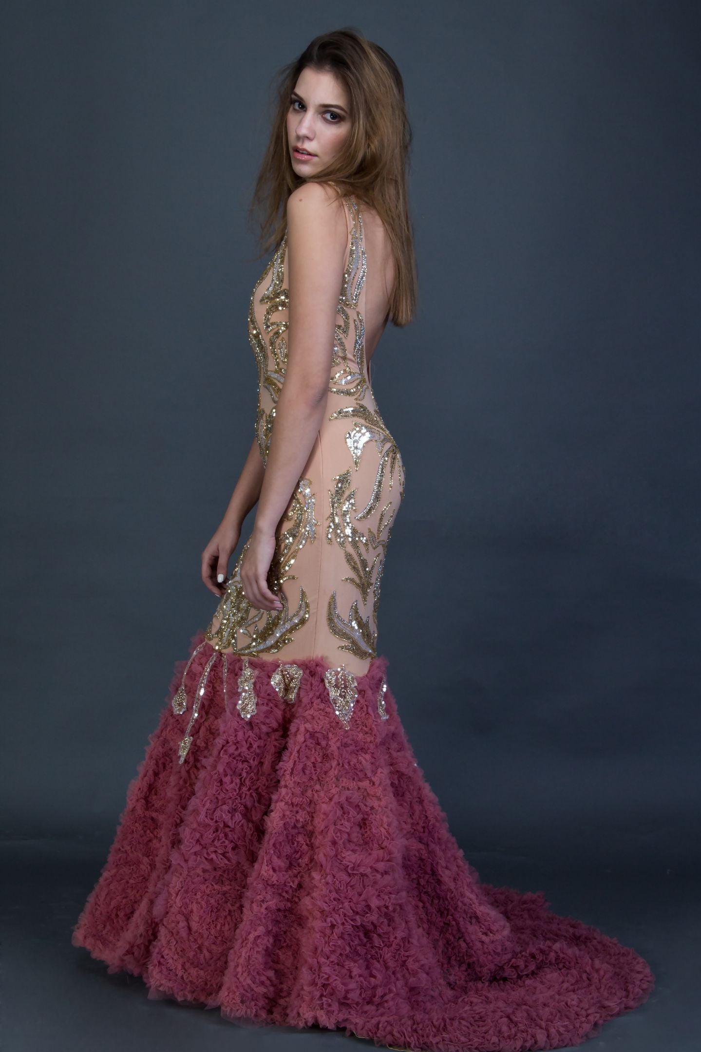 Hand Embellished Beige and silver Swarovski panels with Mesh Flair at the Bottom .Shaped in a structural cutout.