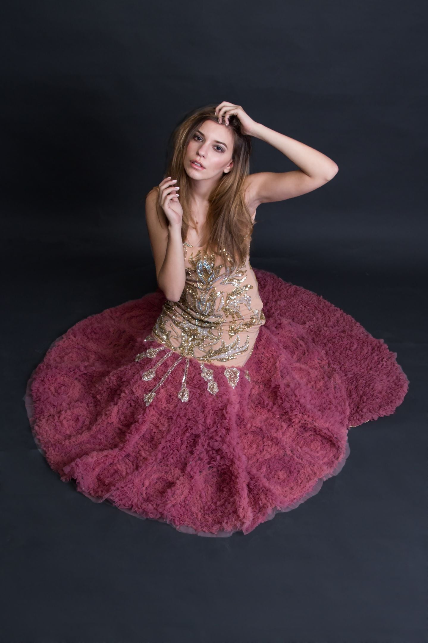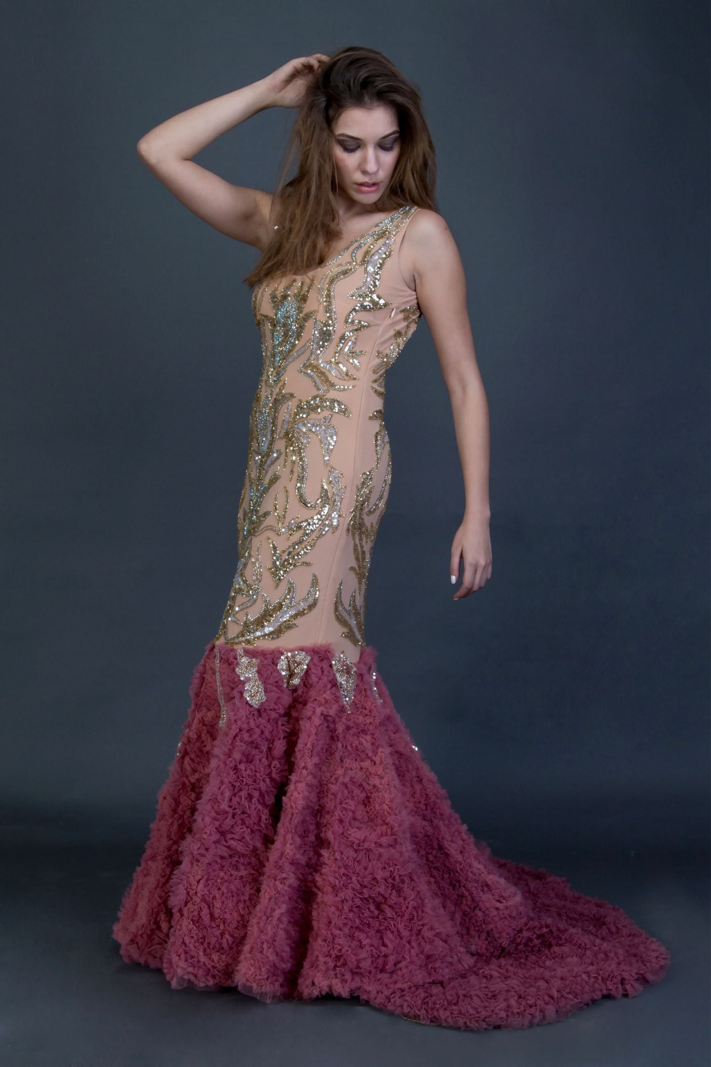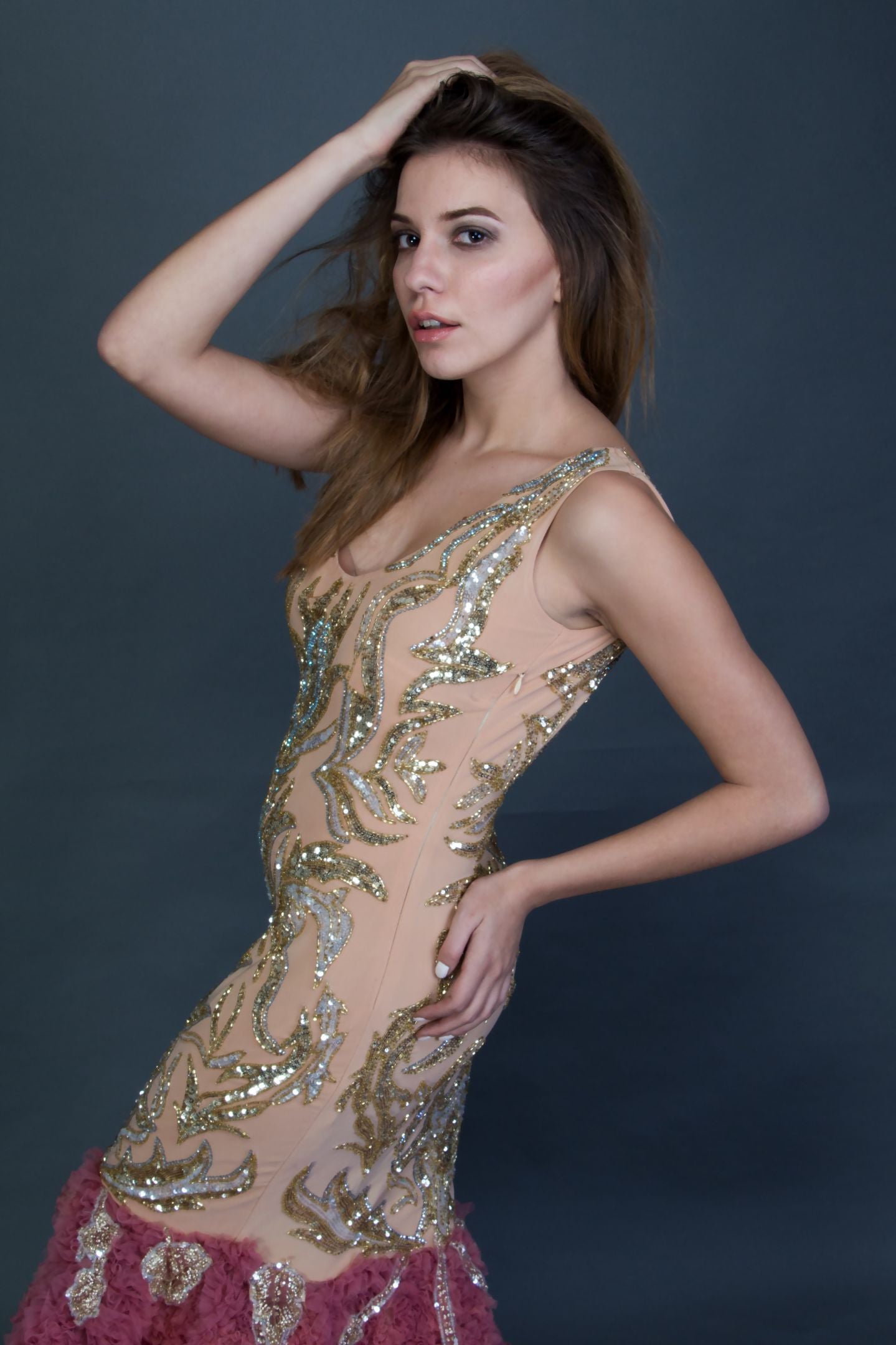 Hand Embellished Beige and silver Swarovski panels with Mesh Flair at the Bottom .Shaped in a structural cutout.