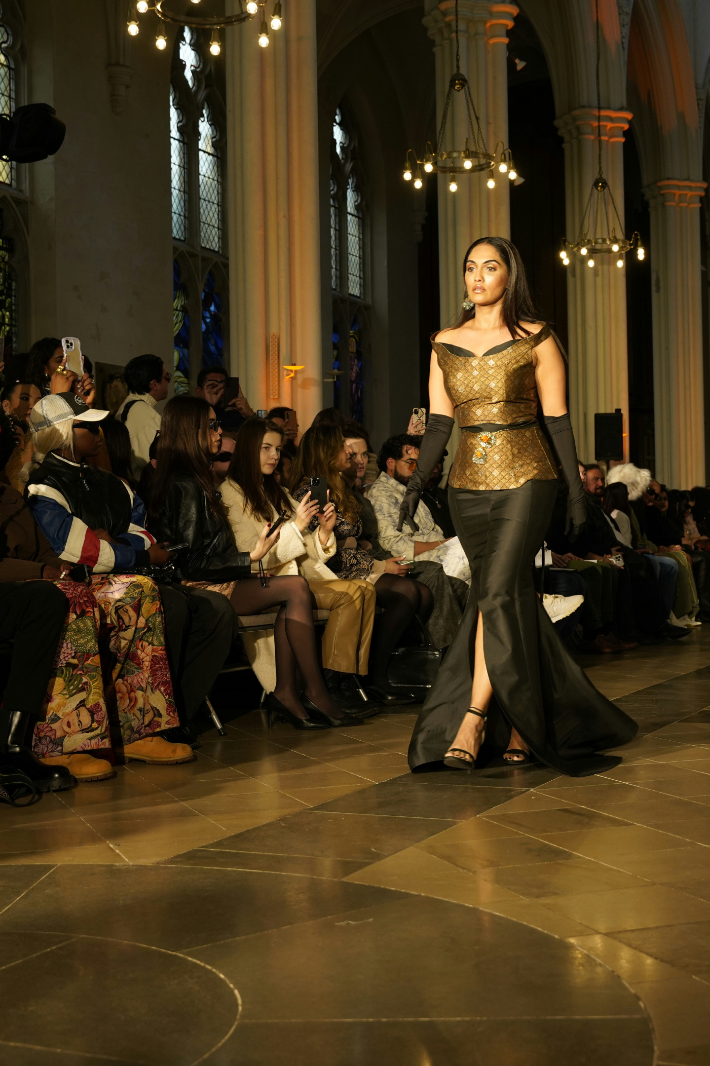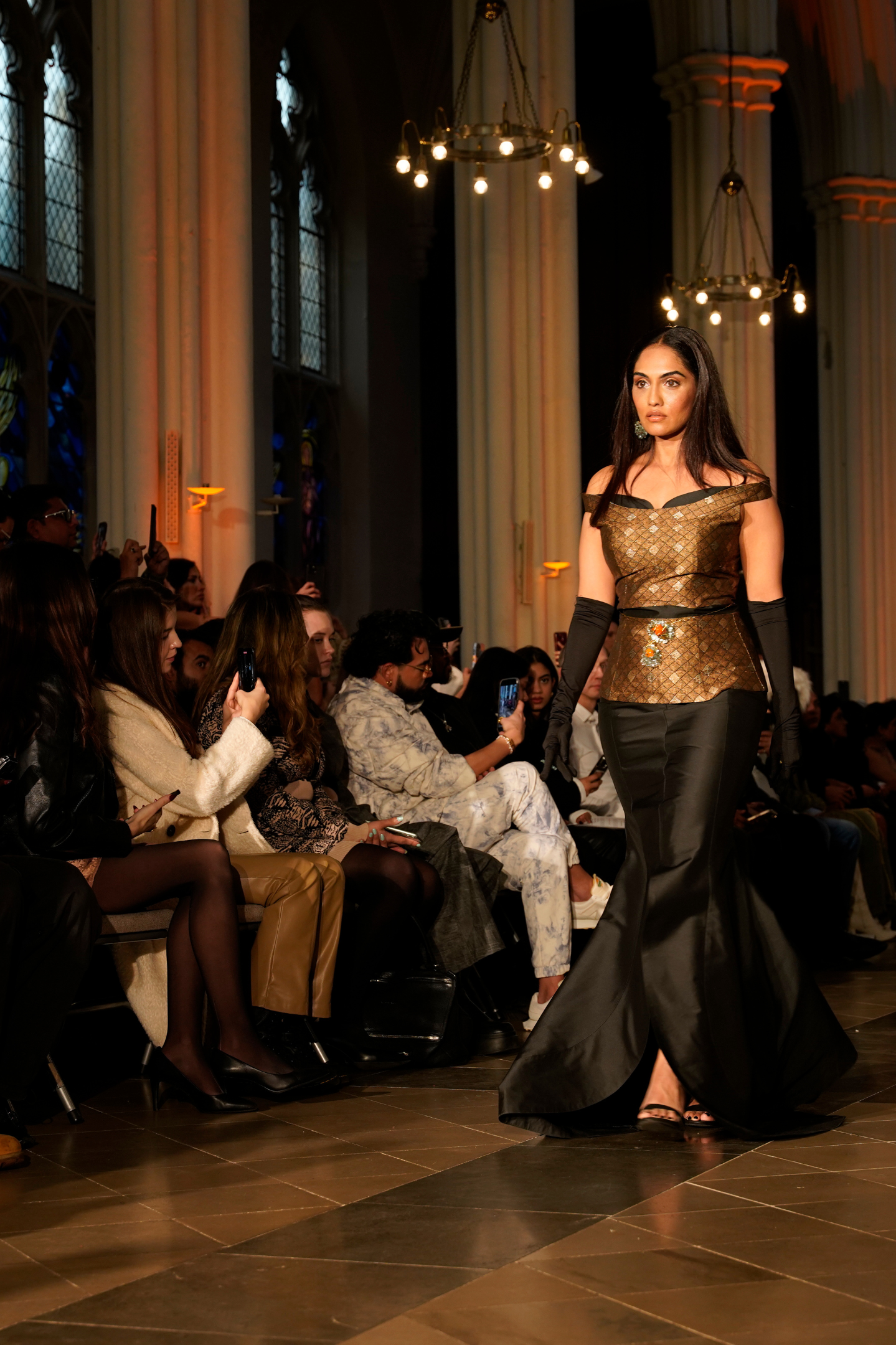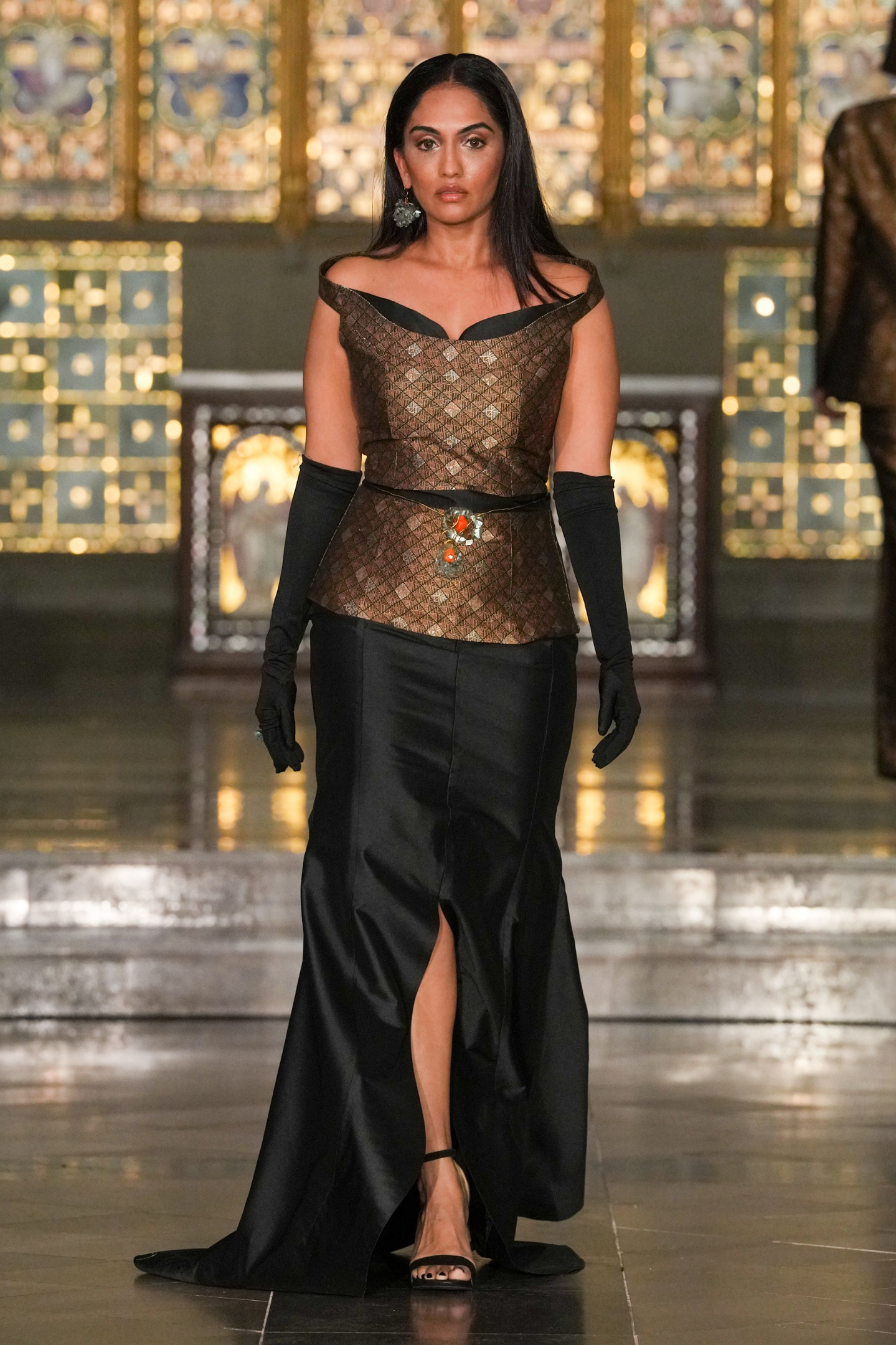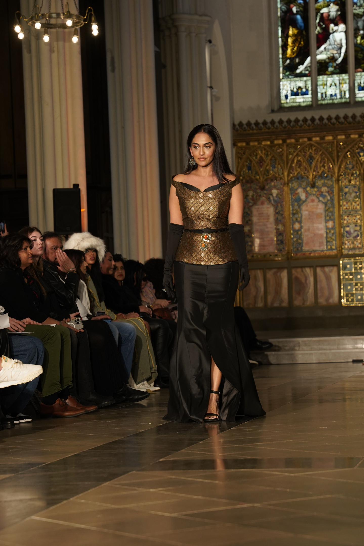 The Brocade long corset commands attention with its intricate patterns and structured design ,cinching the waist and accentuating the curves.Paired seamlessly with a body-hugging fish fit black long skirt ,the outfit exudes a sense of allure and confidence.