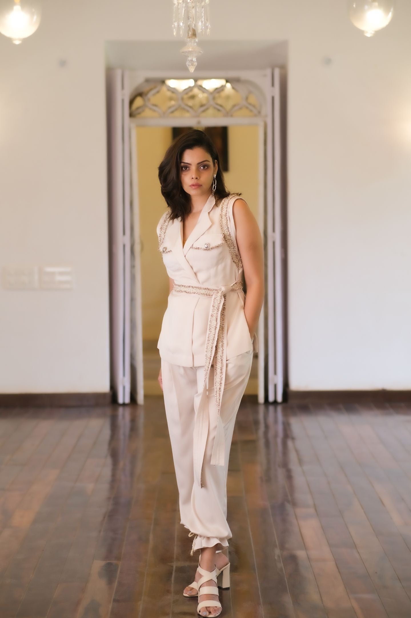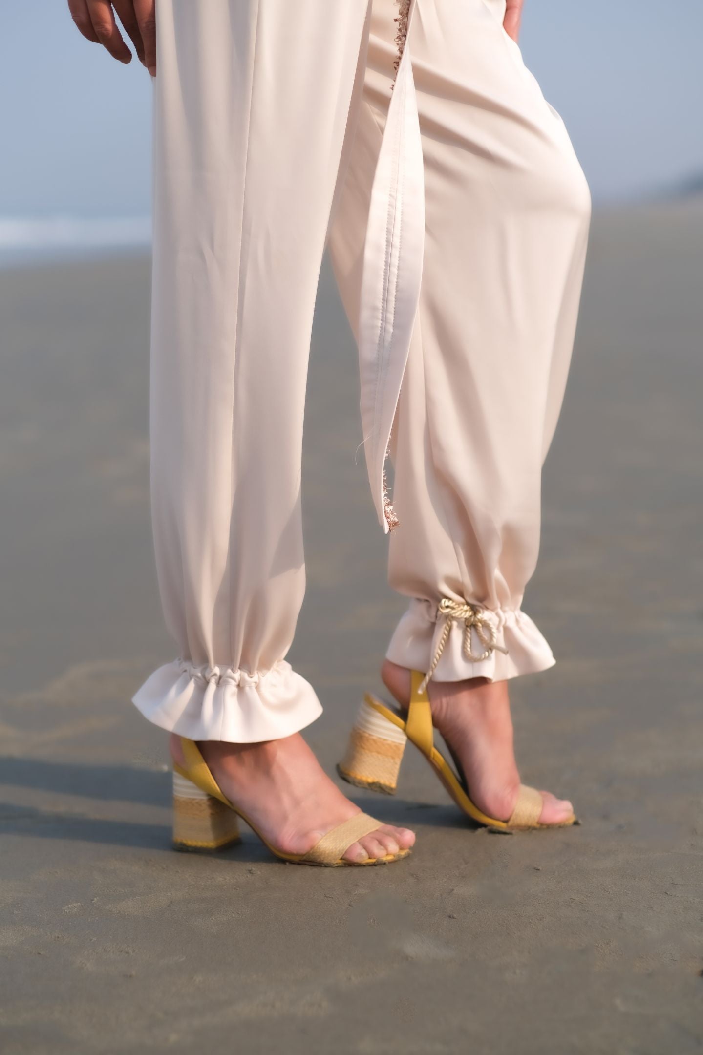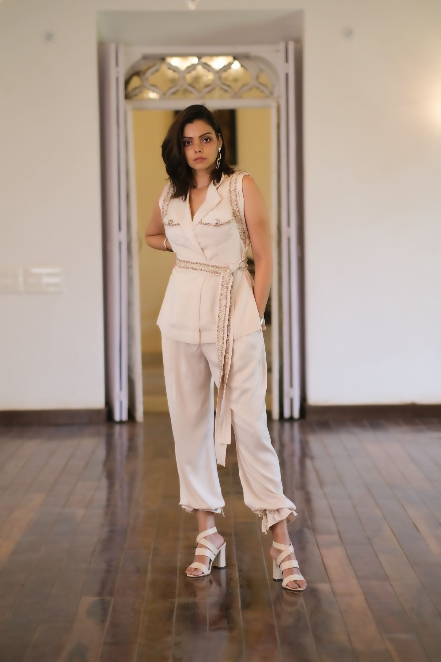 Structured flat collar blouse with belt cinching waist, Mid waist comfortable pants, comfortable luxe fabric, Tie on knots on the ankle.