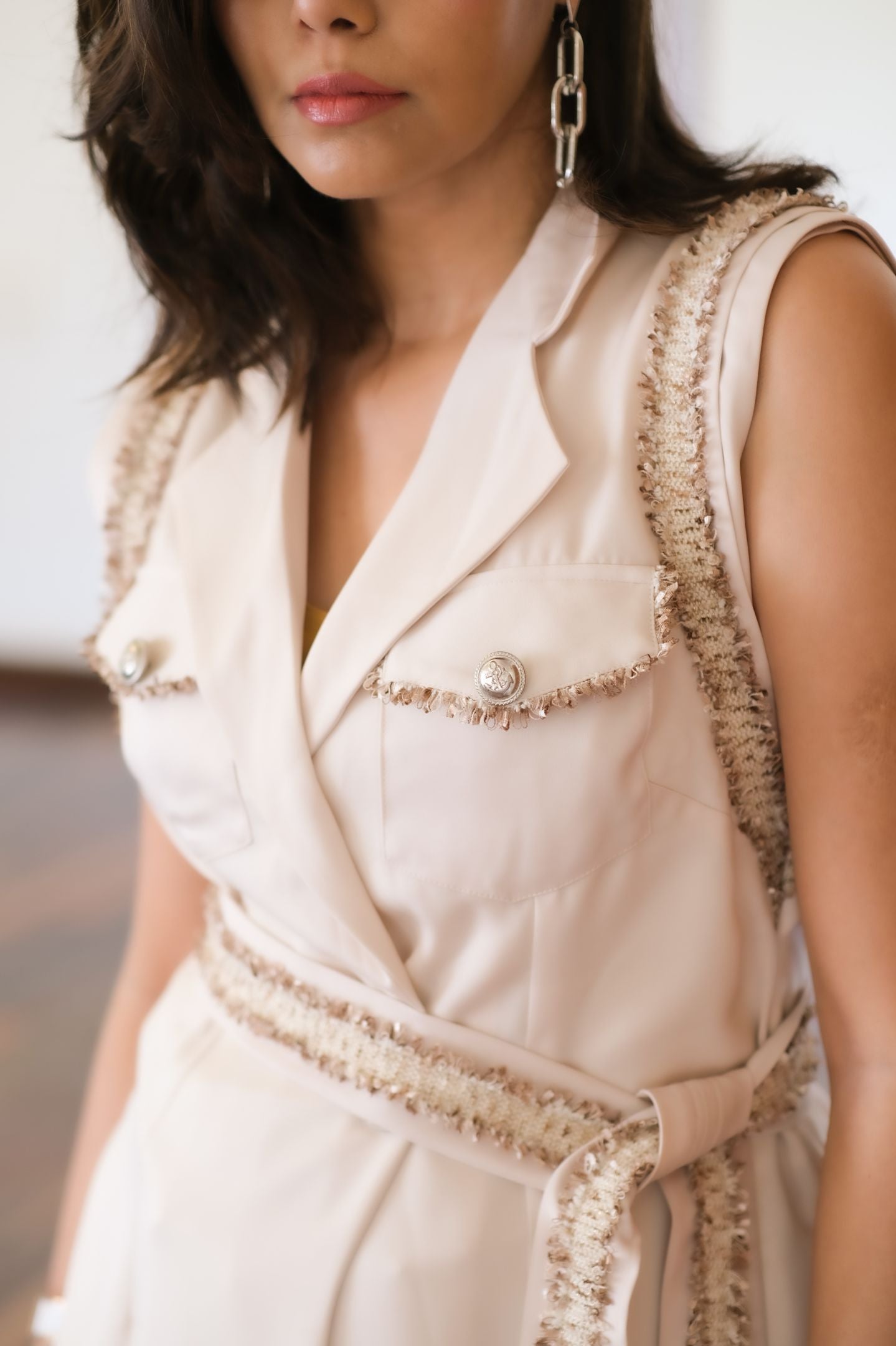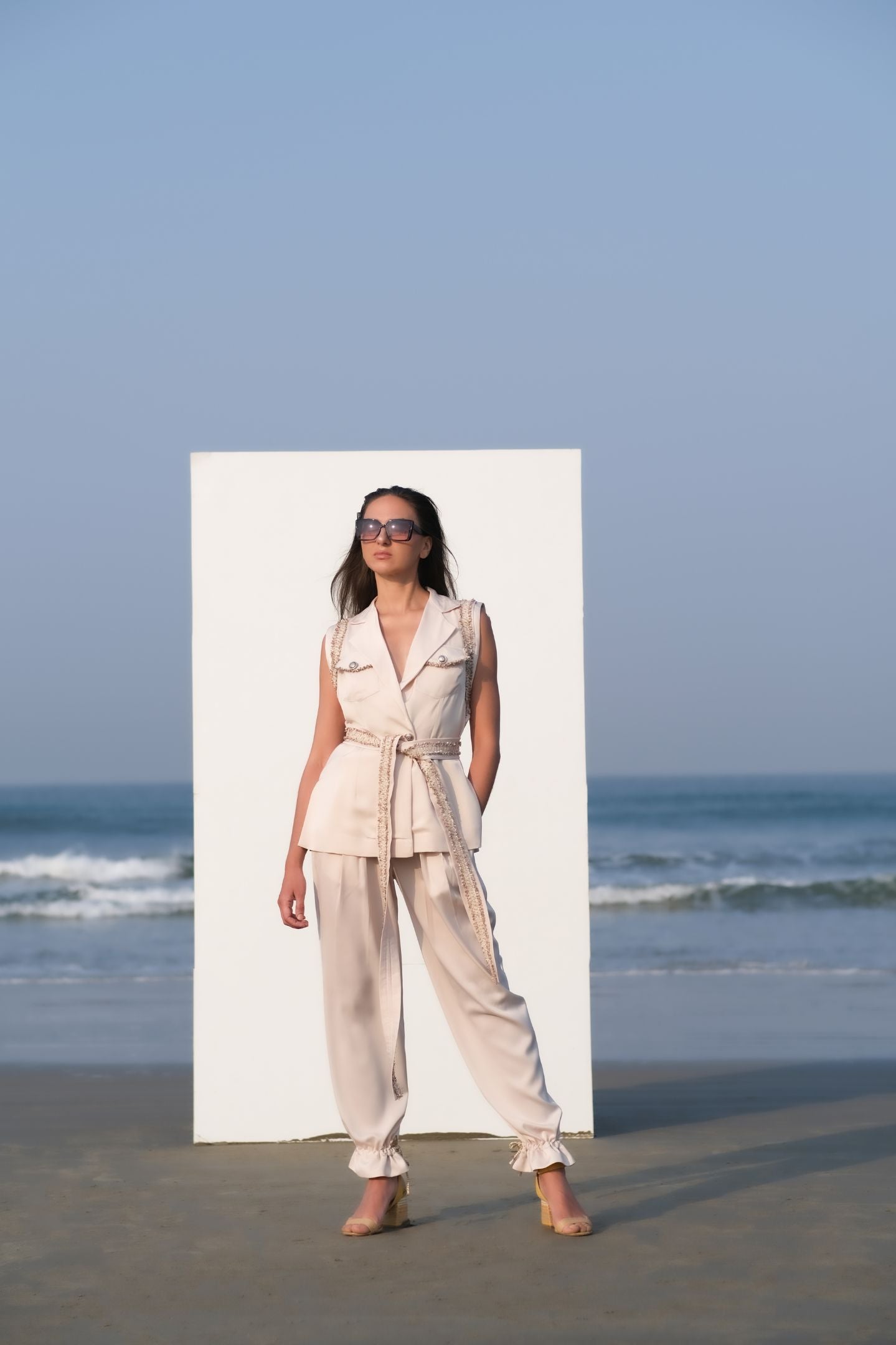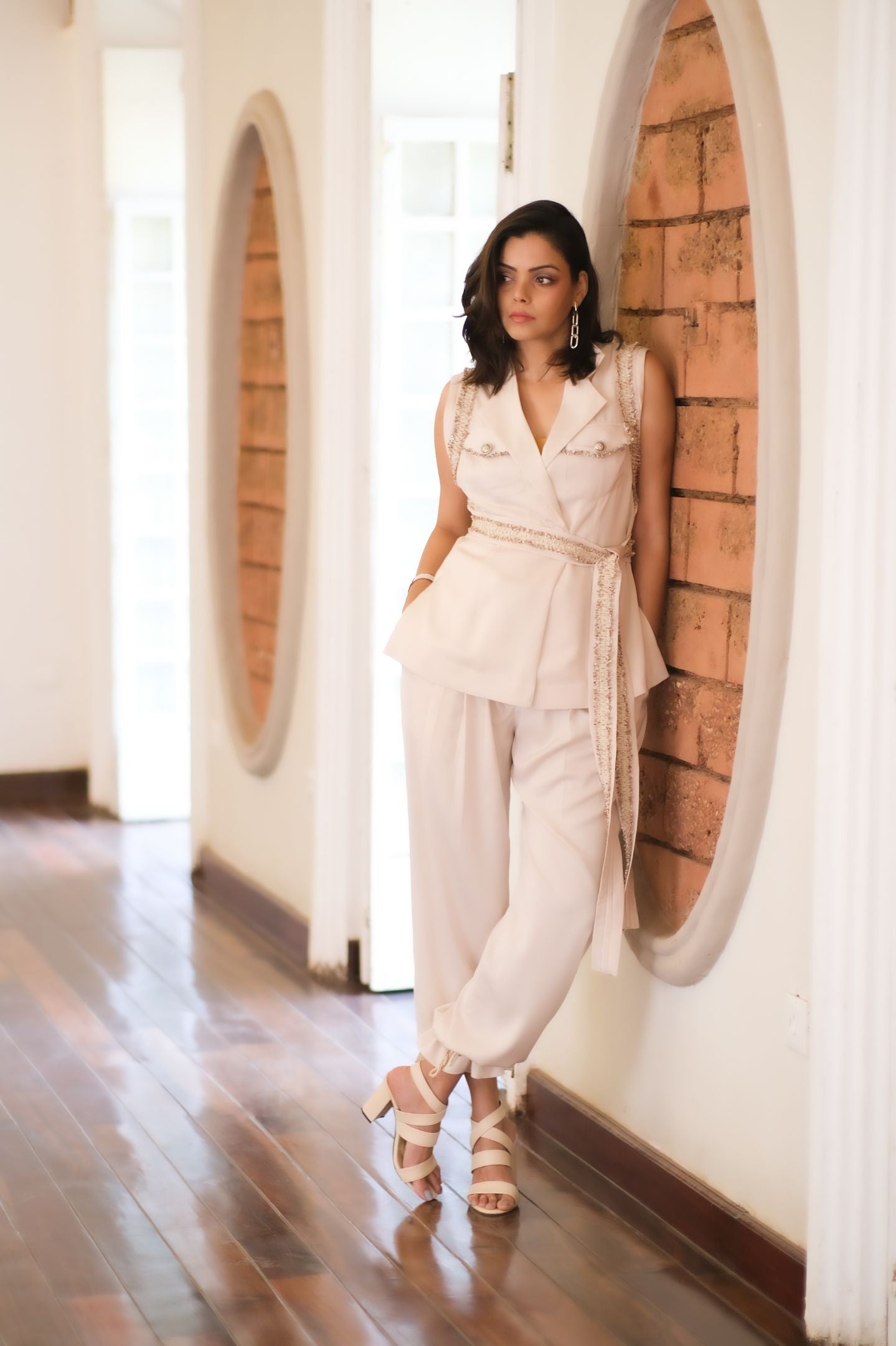 Structured flat collar blouse with belt cinching waist, Mid waist comfortable pants, comfortable luxe fabric, Tie on knots on the ankle.