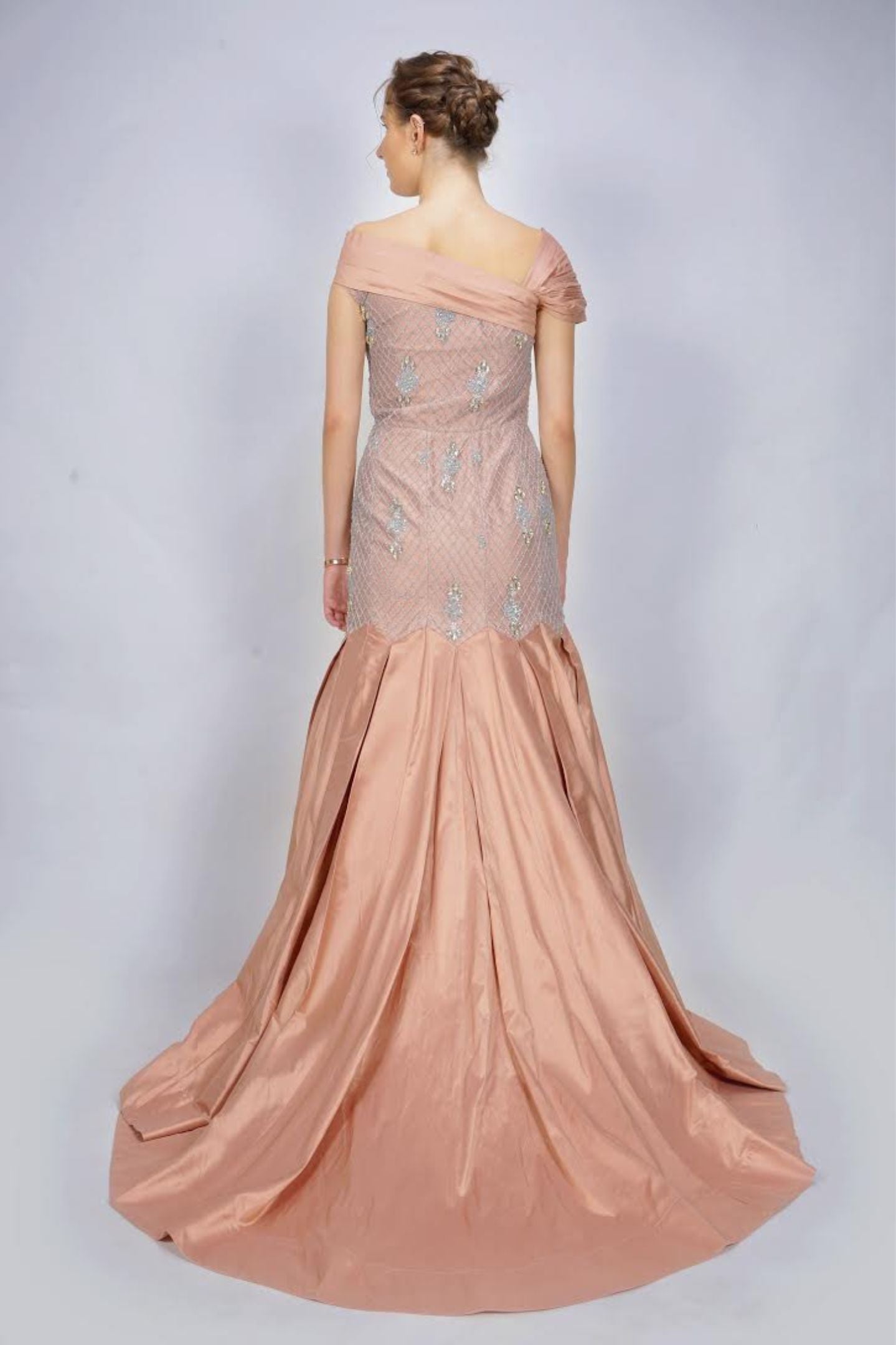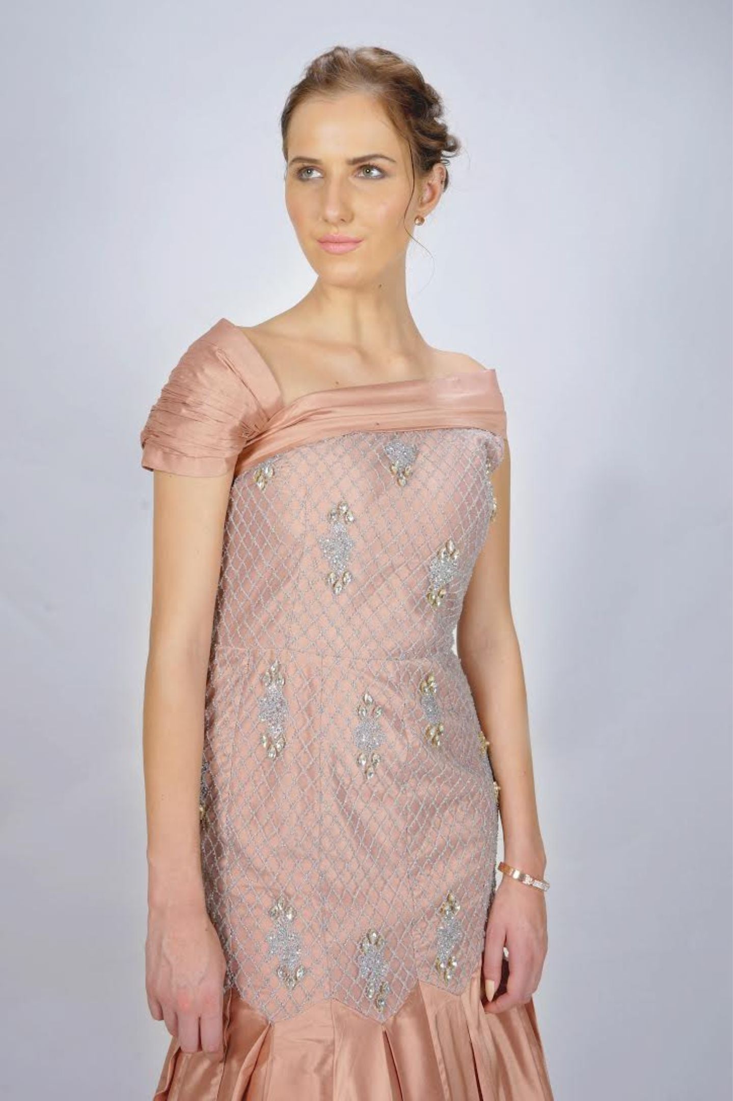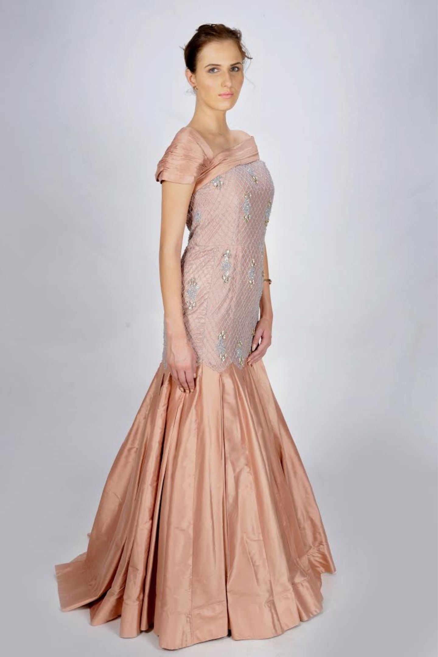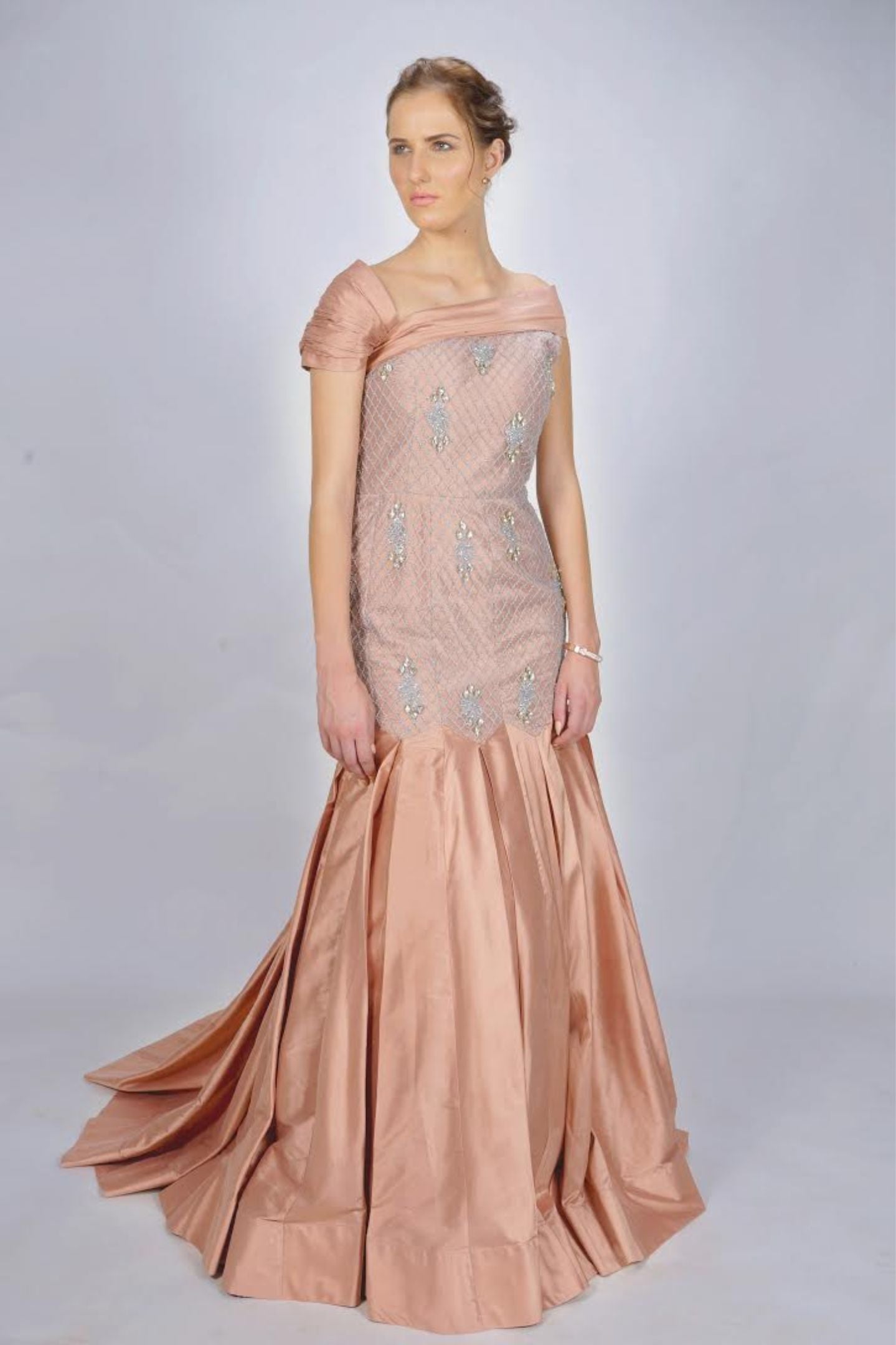 Pearl and Swarovski Embellished, Silk Detailing, Pleated one Shoulder. Box Pleated Flair with extra Volume at the bottom of the gown.