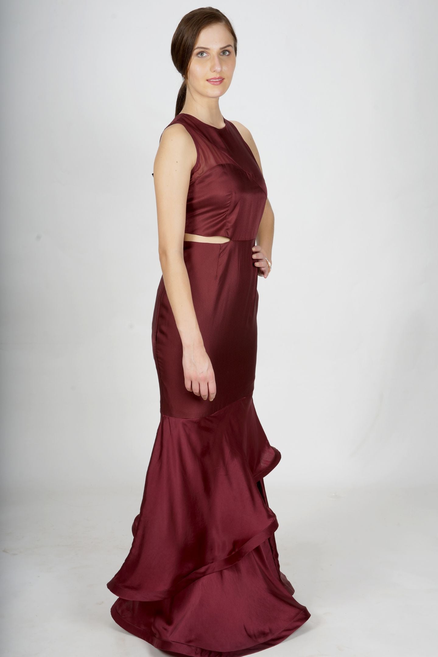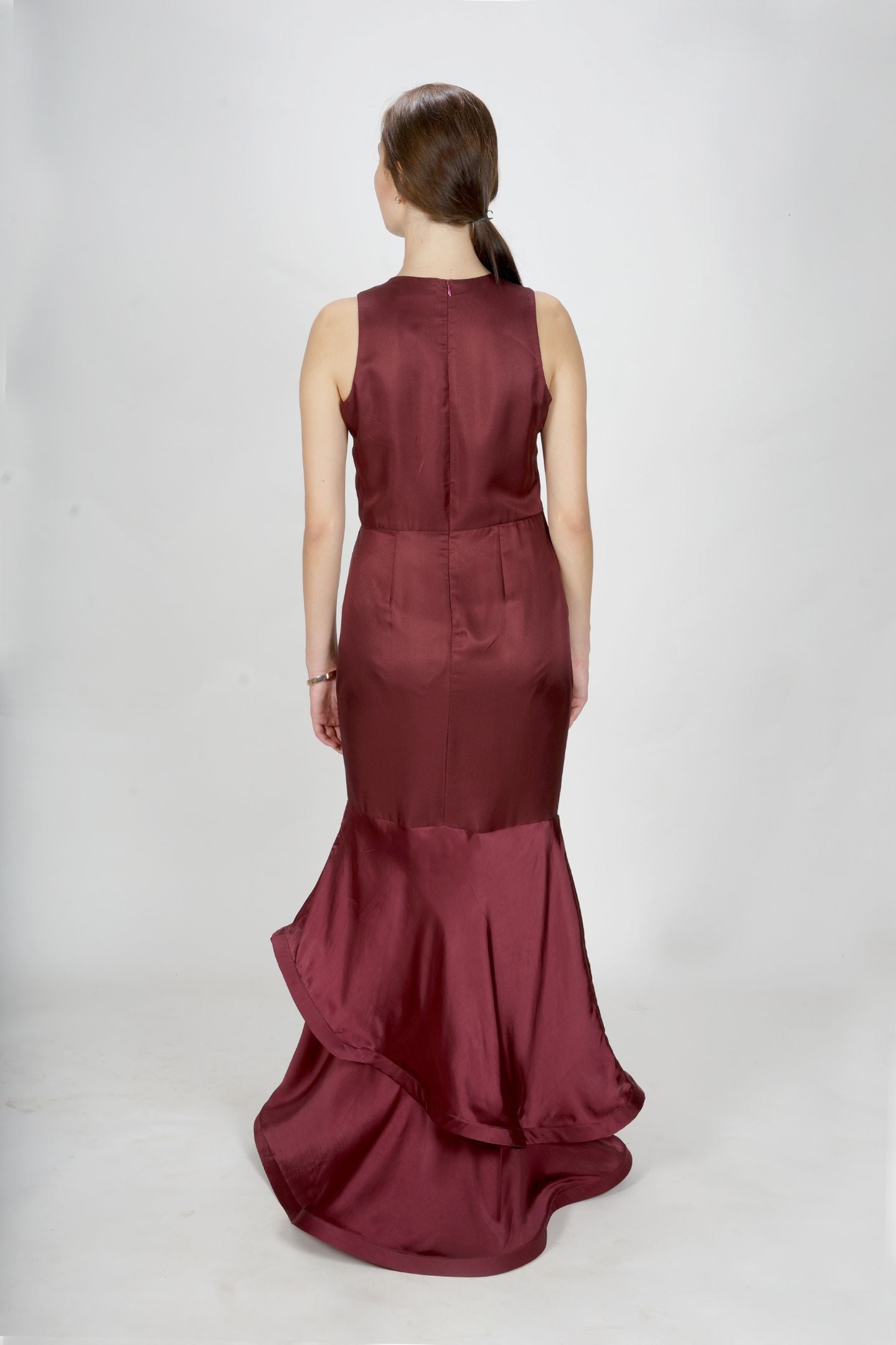 Rubby silk gown explores as a gown brings rich aura and style through its rich silk fabric, and this wine dress with a floor-sweeping mermaid hem is an apt example.